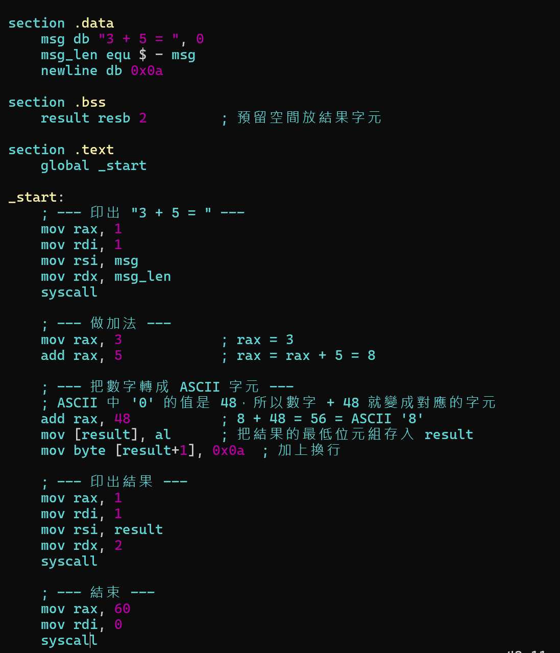 mov rax, 60 ; syscall 編號 60 = exit(結束程式)