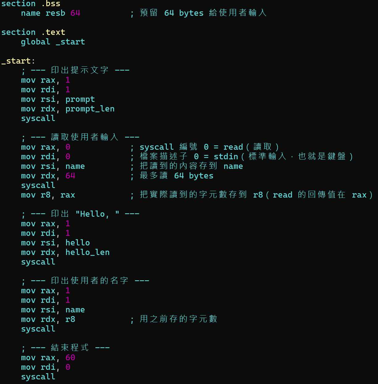 section .bss和resb 64:在.bss區段預留 64 bytes 的未初始化空間,用來存放使用者輸入。- read 系統呼叫(編號 0):從鍵盤讀取輸入。它的回傳值(放在