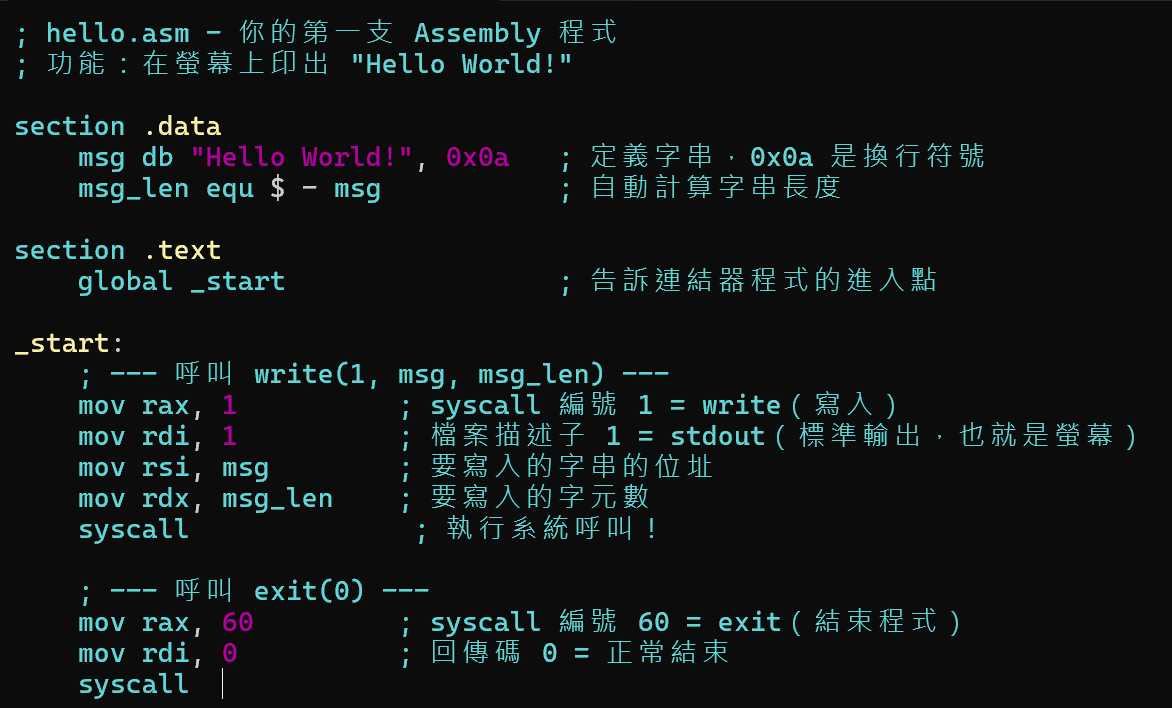 記住核心流程:寫 .asm → nasm 組譯 → ld 連結 → 執行。