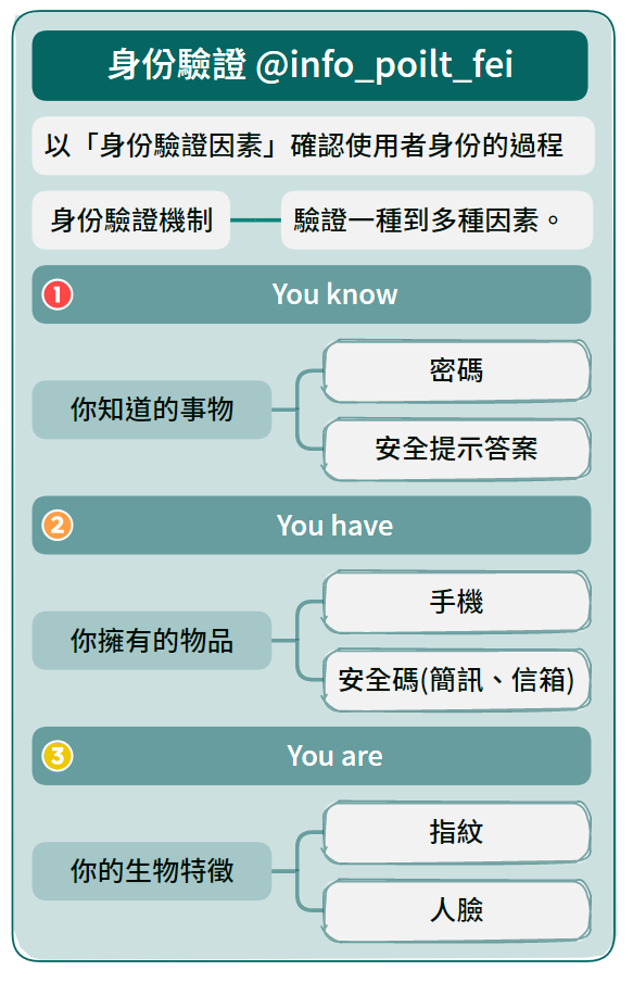 身份驗證是伺服器會透過「身份驗證因素」確認使用者的身份的過程,目前有三種驗證因素